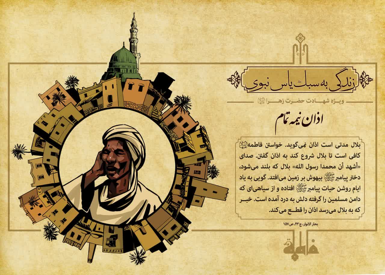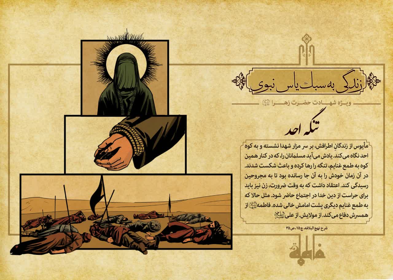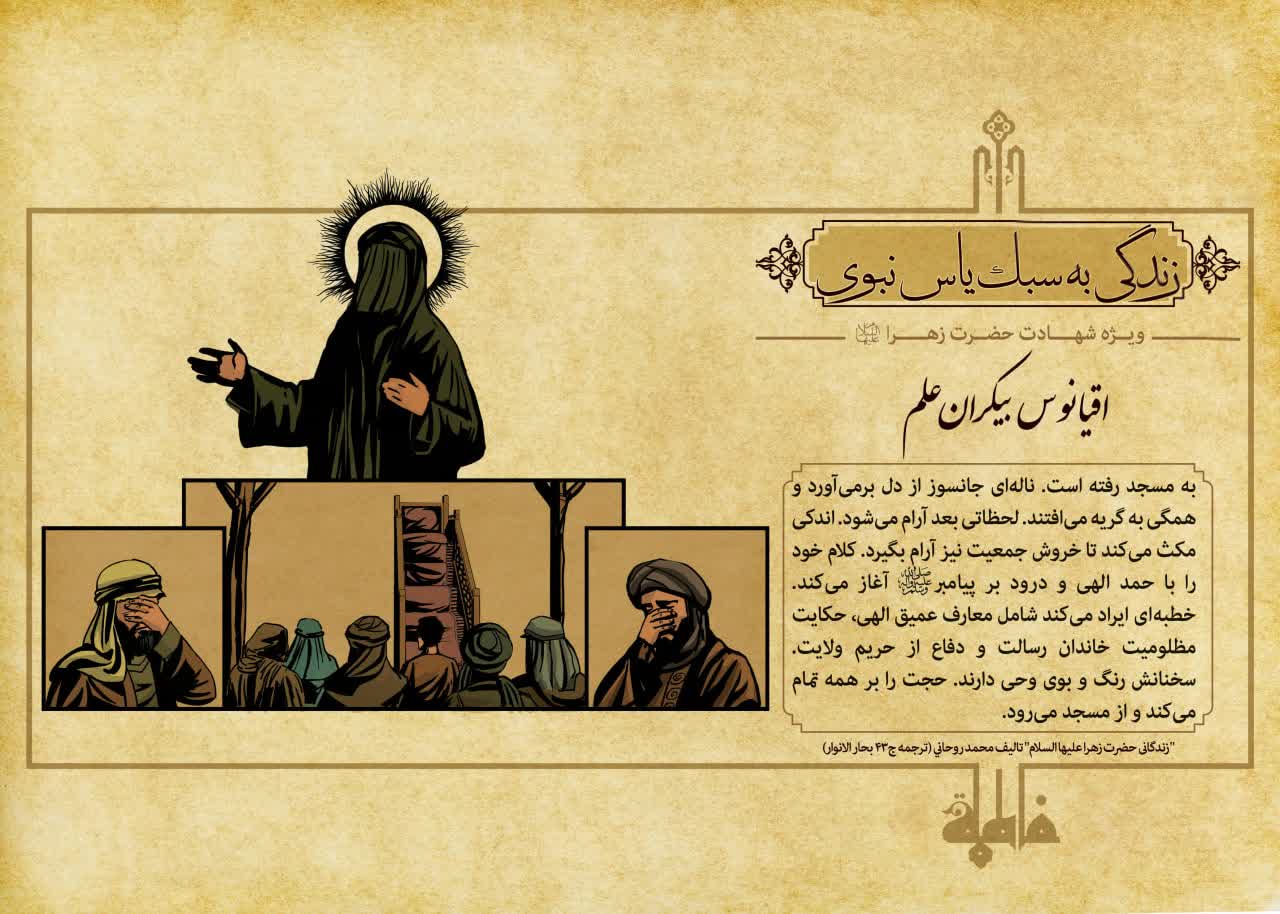 «زهرا(س)، آن روزها، بعد از رحلت رسول خدا(ص) و پیش از آنکه، خود نیز چشم از جهان فرو بندد و در جوار قرب الهی به پدر چشمانتظار خویش بپیوندد، بارها کوچههای مدینه را کاویده بود و به دیدن برخی از «خواص» رفته بود، فاطمه(س) با دلواپسی سفارشهای رسول خدا(ص) را به آنان گوشزد کرده بود و عهدی را که با خدا بسته و اکنون بیمحابا شکسته بودند، به یادشان آورده بود. اما، دلشوره فاطمه(س) که اصرار او را در پی داشت، پاسخی جز سکوت برخی از خواص را به دنبال نداشت و چنین بود که صدای فاطمه(س) در سکوت سنگین و سؤالآفرین آن روزها گم شد.
