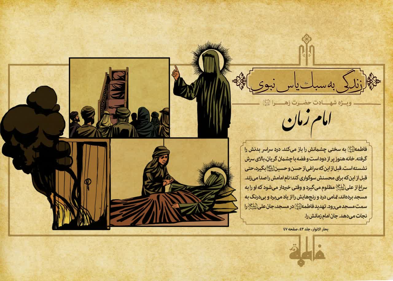 امیرالمؤمنین(ع) بر تربت پاک زهرا(س) که قرار است تا ظهور مراد غایبمان (ارواحنا له الفداء) بینشان بماند نشسته است و با پیامبر خدا(ص) نجوا میکند؛ «ای رسول خدا... سلام من و دخترت را که به دیدار تو آمده و در جوار تو به خاک رفته، پذیرا باش... اکنون امانت به صاحبش رسیده، زهرا از کنار من دامن کشیده و نزد تو آرمیده است... بعد از او، آسمان و زمین زشت مینماید و اندوه دلم، هرگز نمیگشاید... رفتن فاطمه، دلم را خسته و غصهام را پیوسته کرد و چه زود جمع ما به پریشانی کشید... شکایت خود به خدا میبرم و دخترت را به تو میسپارم. زهرا خواهد گفت که پس از تو چه ستمها بر او روا داشتند... آنچه میخواهی از او بجوی و هرچه میخواهی با او بگوی، تا راز دل نزد تو بگشاید و خون دلی که فرو داده است، برون آید... ای پیامبر خدا... دخترت زهرا، پنهانی به خاک میرود و حال آنکه، هنوز چند روزی بیش، از رحلت تو سپری نشده و هنوز نامت از زبانها نیفتاده است... ای فاطمه!... اگر بیم آن نبود که ستمگران چیره شوند، برای همیشه در کنار مزارت میماندم و در این ماتم بزرگ جوی اشک از دیده میراندم و...»...