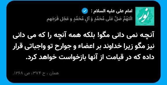 امام علي عليه السلام : آنـچـه نمى دانى مگو! بلكه همه آنچه را كه مى دانى نيز مگو زيرا خداوند بر اعضاء و جوارح تو واجباتى قرار داده كه در قيامت از آنها بازخواست خواهد كرد.