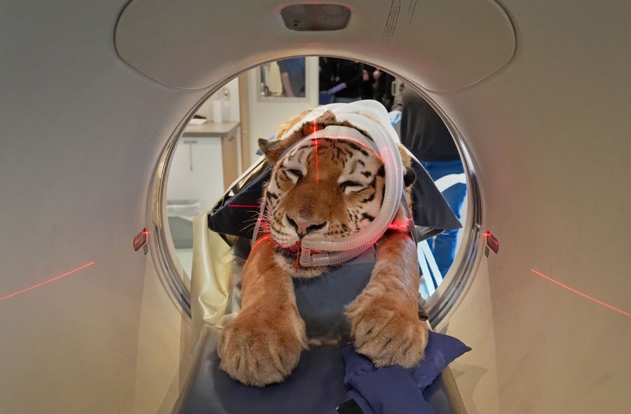 تصویری از انجام "سی تی اسکن" از ببر در انگلیس را مشاهده می کنید.