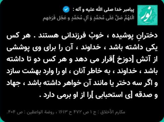 پيامبر خدا صلي الله عليه و آله: دخترانِ پوشيده، خوبْ فرزندانى هستند. هر كس يكى داشته باشد، خداوند، آن را براى وى پوششى از آتش [دوزخ ]قرار مى دهد و هر كس دو تا داشته باشد ، خداوند ، به خاطر آنان، او را وارد بهشت سازد و اگر سه دختر يا مانند آن خواهر داشته باشد، جهاد و صدقه [ى استحبابى ]را از او برمى دارد. مكارم الأخلاق : ج 1 ص 472 ح 1613 ، روضة الواعظين : ص 404.