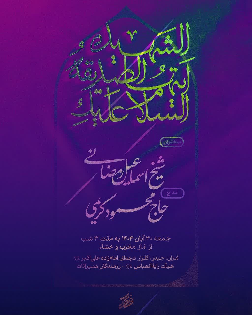 مراسم عزاداری فاطمیه دوم با سخنرانی شیخ اسماعیل رمضانی و مداحی حاج محمود کریمی جمعه ۳۰ آبان به مدّت ۳ شب برگزار می شود.
