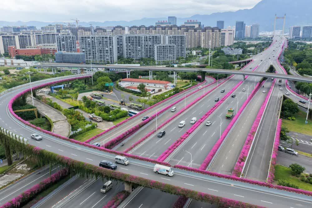 تصویری از گل‌های "بوگنویلا" در امتداد بزرگراه های شهر فوژو چین