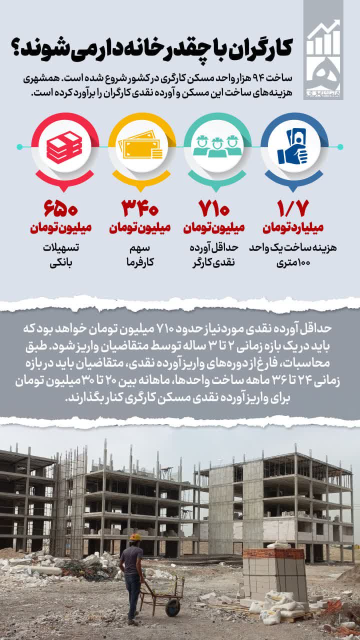 ساخت ۹۴ هزار واحد مسکن کارگری در کشور شروع شده است. هزینه های ساخت این مسکن و آورده نقدی کارگران در اینفوگرافیک زیر برآورد شده است.