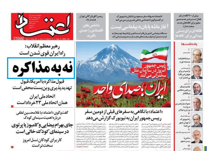 در حالی که شب گذشته رهبر معظم انقلاب به مواردی از دلایل مختلف، عقلانی و متقن چرایی عدم مذاکره ایران با آمریکا اشاره کردند، روزنامه اصلاح طلب اعتماد متعلق به الیاس حضرتی، رئیس شورای اطلاع رسانی دولت تیتر تحریف آمیز «نه به مذاکره»(!) را برای بیانات تبیینی دقیق ایشان انتخاب کرده است که گویی صرفا یک اصرار به موضع است!