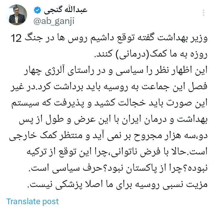 عبدالله گنجی در صفحه شخصی خود در ایکس نوشت: وزیر بهداشت گفته توقع داشتیم روس ها در جنگ 12 روزه به ما کمک درمانی کنند این اظهار نظر را سیاسی و در راستای آلرژی چهار فصل این جماعت به روسیه باید برداشت کرد.