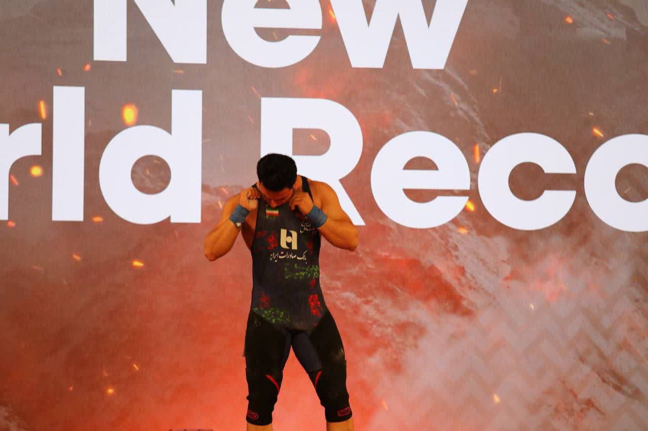 بوسه علیرضا معینی پسر طلایی وزنهبرداری روی پرچم مقدس ایران پس از شکستن رکورد جهان.