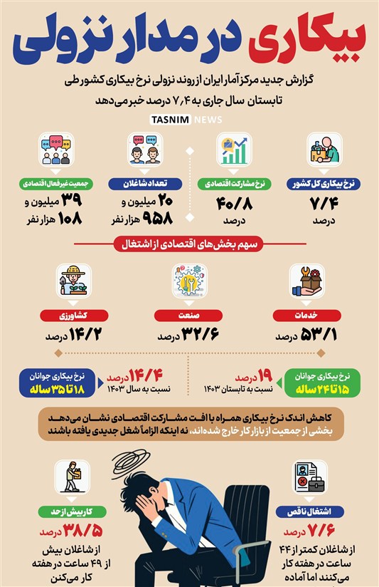 گزارش جدید مرکز آمار ایران از روند نزولی نرخ بیکاری کشور طی تابستان سال جاری به 7.4 درصد خبر میدهد. کاهش اندک نرخ بیکاری همراه با افت مشارکت اقتصادی نشان میدهد بخشی از جمعیت از بازار کار خارج شدهاند، نه اینکه الزاماً شغل جدیدی یافته باشند.