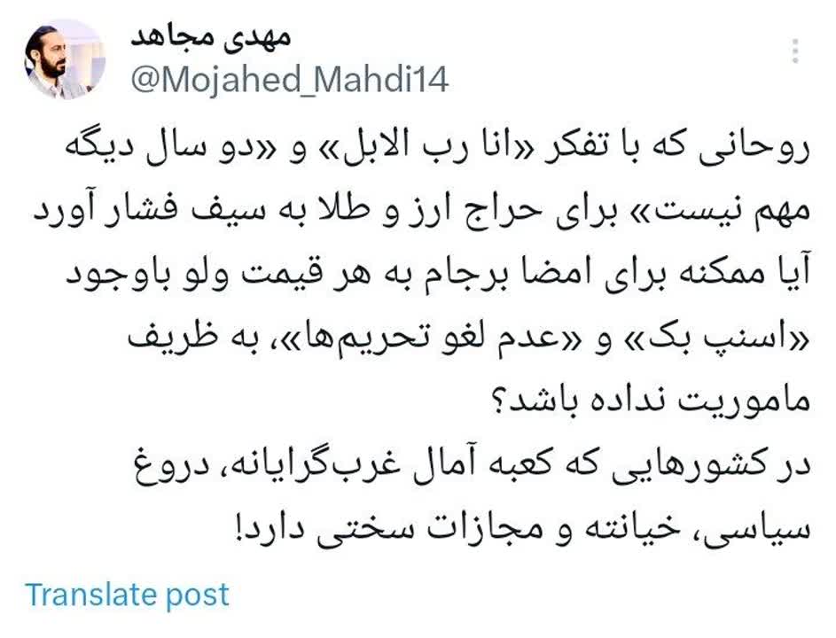 مهدی مجاهد معاون دفتر شهید رئیسی در صفحه شخصی خود در ایکس نوشت: در کشورهایی که کعبه آمال غرب گرایان است، دروغ سیاس، خیانت است و مجازات سختی دارد.