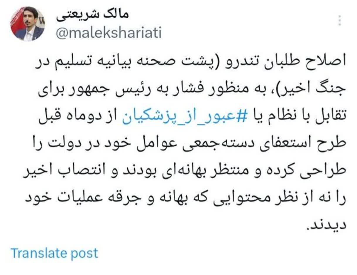 مالک شریعتی، نماینده تهران در صفحه شخصی خود در ایکس نوشت: اصلاح طلبان تندرو از دو ماه قبل طرح استعفای دسته جمعی عوامل خود در دولت را برای فشار به پزشکیان طراحی و منتظر بهانه بودند