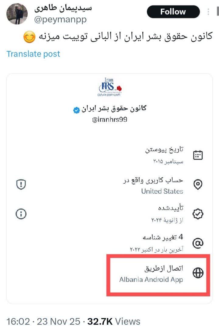 یکی از کاربران ایکس در صفحه شخصی خود در ایکس نوشت: کانون حقوق بشر ایران از آلبانی توئیت می‌زند!