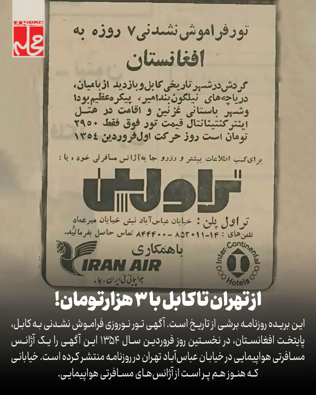 این آگهی تاریخی، سفری نوروزی از تهران به کابل را در نخستین روز فروردین ۱۳۵۴ روایت میکند. تور فراموشنشدنیای که تنها با سه هزار تومان برگزار میشد و توسط یکی از آژانسهای هواپیمایی خیابان عباسآباد تهران خیابانی که هنوز هم پر از آژانسهای مسافرتی است و در روزنامه آن روزگار منتشر شده بود.