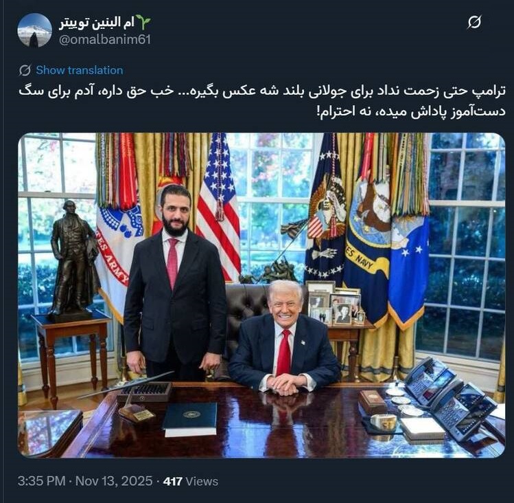 یک کاربر فضای مجازی در توئیتر نوشت: ترامپ حتی زحمت نداد برای جولانی بلند شه عکس بگیره... خب حق داره، آدم برای سگ دستآموز پاداش میده، نه احترام!