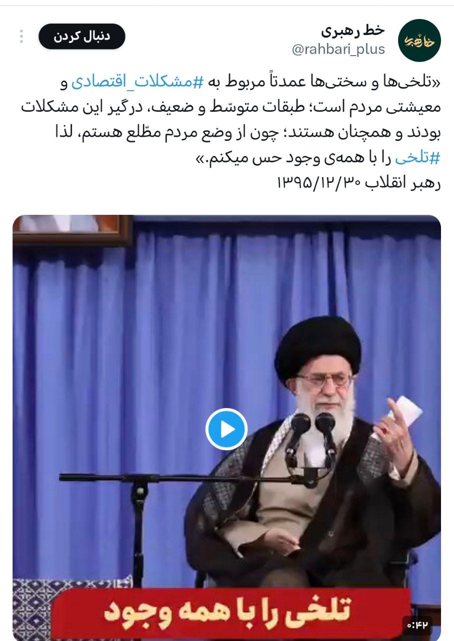 «تلخیها و سختیها عمدتاً مربوط به #مشکلات_اقتصادی و معیشتی مردم است؛ طبقات متوسّط و ضعیف، درگیر این مشکلات بودند و همچنان هستند؛ چون از وضع مردم مطّلع هستم، لذا #تلخی را با همهی وجود حس میکنم.» رهبر انقلاب ۱۳۹۵/۱۲/۳۰