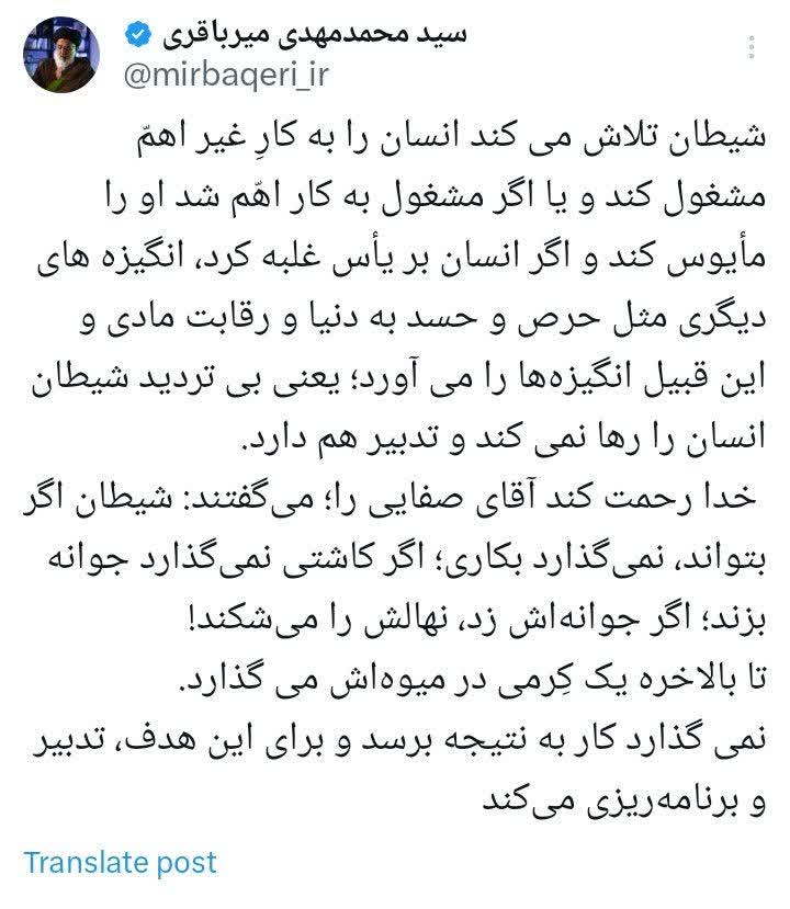 آیت الله میرباقری در صفحه شخصی خود در ایکس نوشت: بی تردید شیطان انسان را رها نمی کند و تدبیر هم دارد.