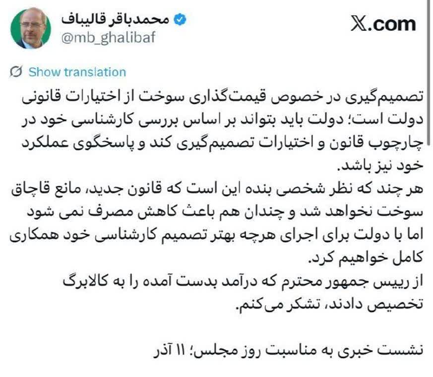 قالیباف رئیس مجلس در نشست خبری به مناسبت روز مجلس اظهار داشت: قانون جدید قیمت سوخت مانع قاچاق سوخت نخواهد شد و چندان هم باعث کاهش مصرف نمی شود.