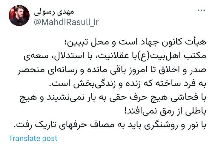 مهدی رسولی مداح اهل بیت(ع) در صفحه شخصی خود در ایکس نوشت: با فحاشی هیچ حرف حقی به بار نمی نشیند و باطلی از رمق نمی افتد.