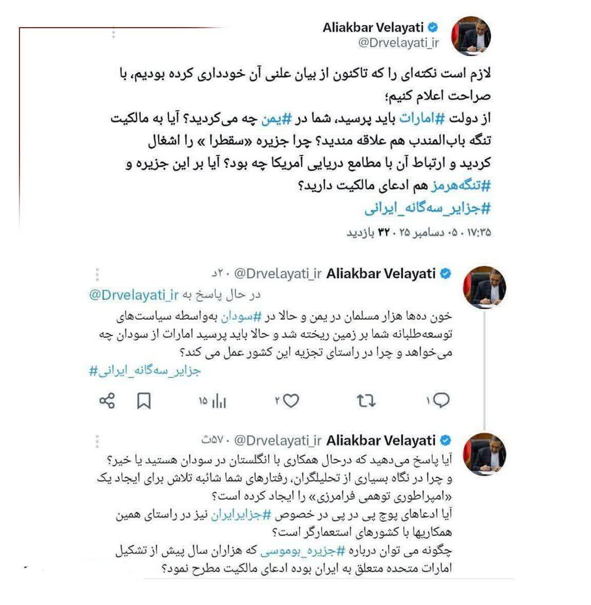 علی اکبر ولایتی مشاور ارشد مقام معظم رهبری در صفحه شخصی خود در ایکس به ادعای امارات درباره جزاریر سه گانه ایران واکنش نشان داده است.