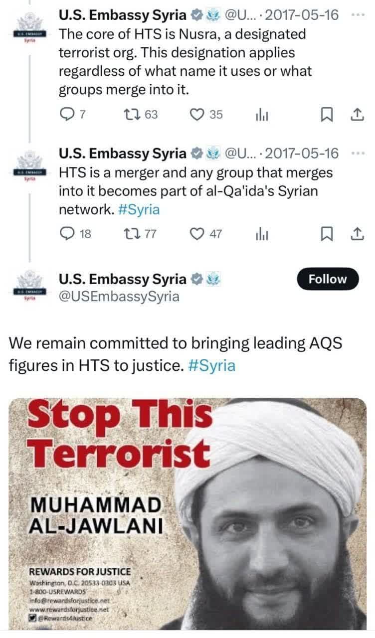 تصویر توییت سفارت آمریکا در سوریه ، مربوط به سال ۲۰۱۷ که از مردم می خواهد با دادن اطلاعات درباره محمد الجولانی رییس گروه Hts (هیئت تحریرالشام ) به شناسایی و دستگیری او کمک کنند!