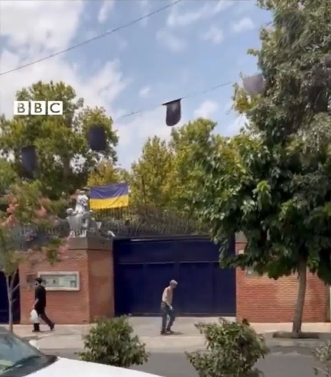 سفارت انگلیس در تهران پرچم اوکراین را بر سر در خود نصب کرده است.