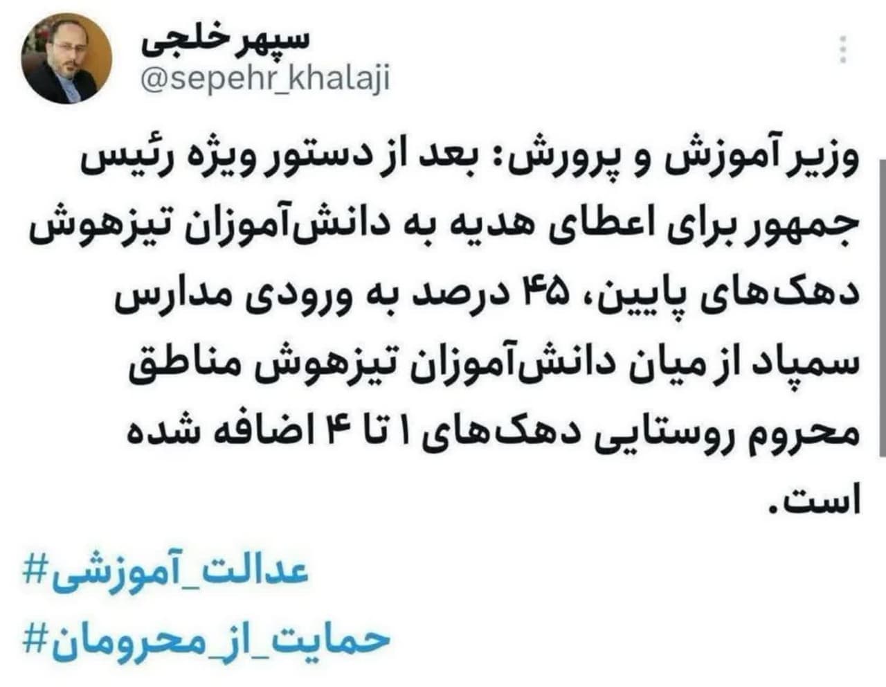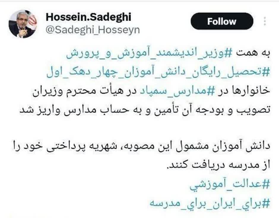 حسین صادقی مسئول روابط عمومی وزارت آموزش و پرورش در حالی خبر از رایگان شدن تحصیل دانشآموزان دهک اول تا چهارم در مدارس سمپاد داده که این تصمیم پیش از این در هیأت دولت سیزدهم تصویب و اجرایی شده بود!