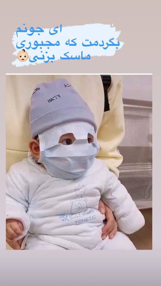 تصویری از نحوه ماسک پوشیدن متفاوت یک نوزاد در روزهای کرونایی را مشاهده می کنید.