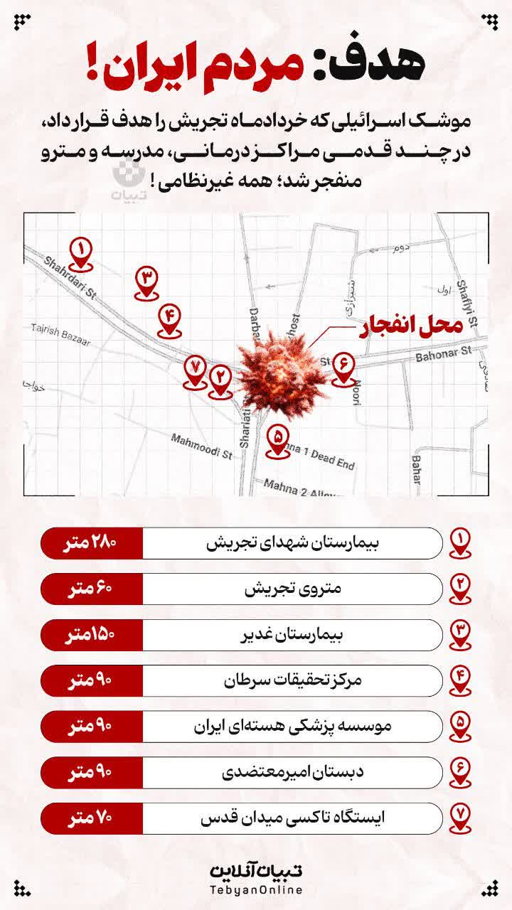 موشک اسرائیلی که خردادماه تجریش را هدف قرار داد، در چند قدمی مراکز درمانی، مدرسه و مترو منفجر شد؛ همه غیرنظامی!